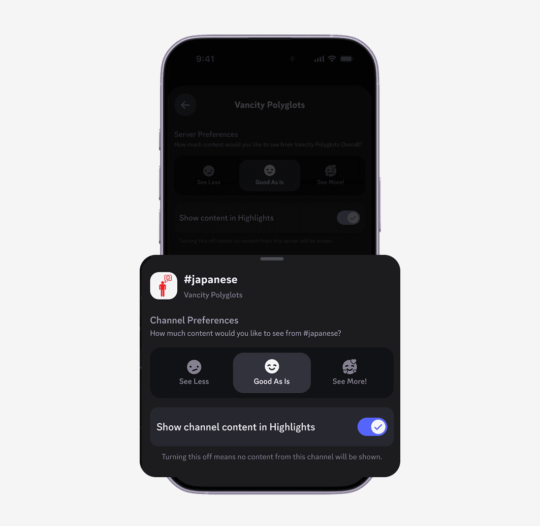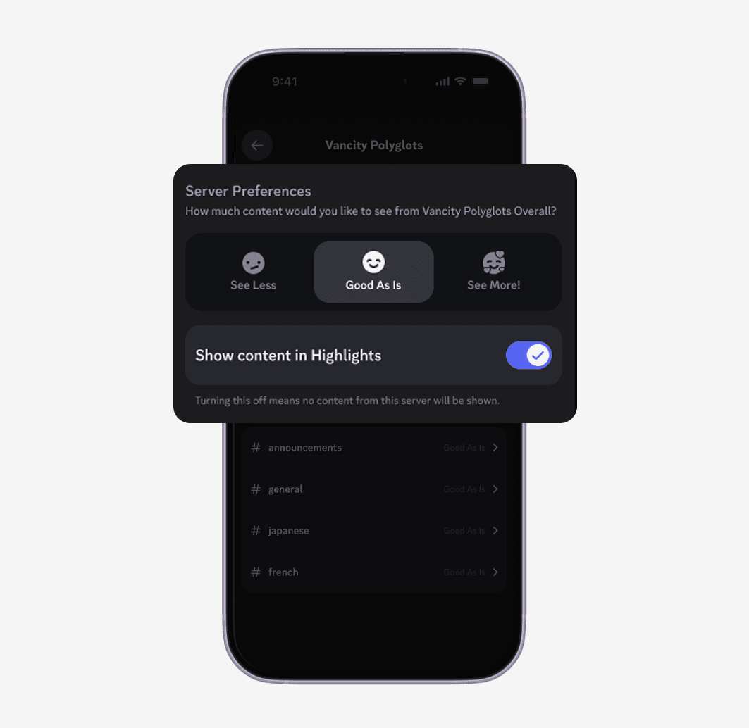 Highlights makes an initial relevance guess but users stay in control. Server level and channel level settings let them tune what appears over time instead of relying on a ranking system they can't see or adjust.
